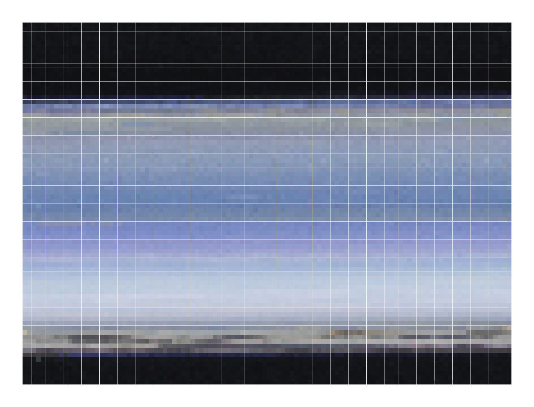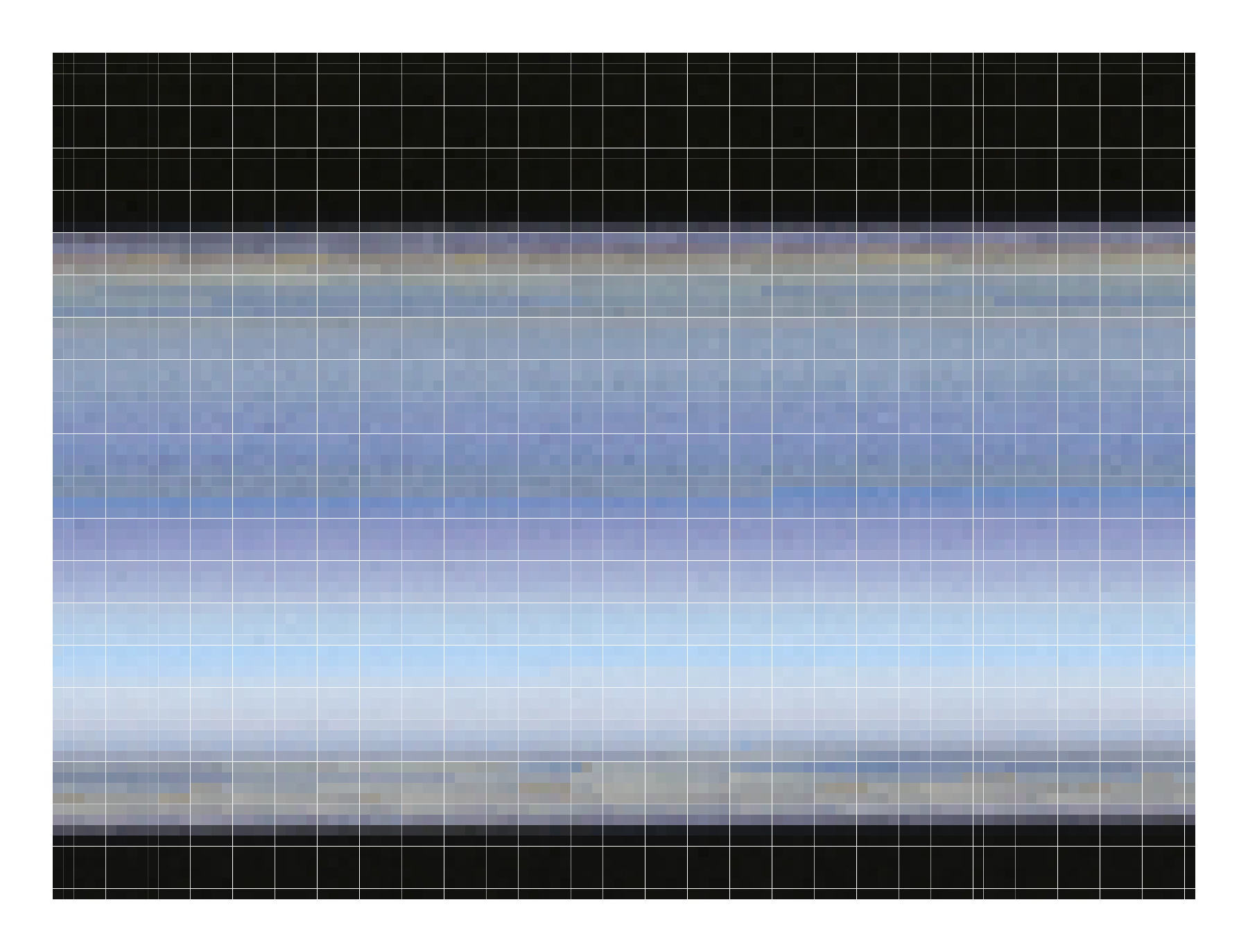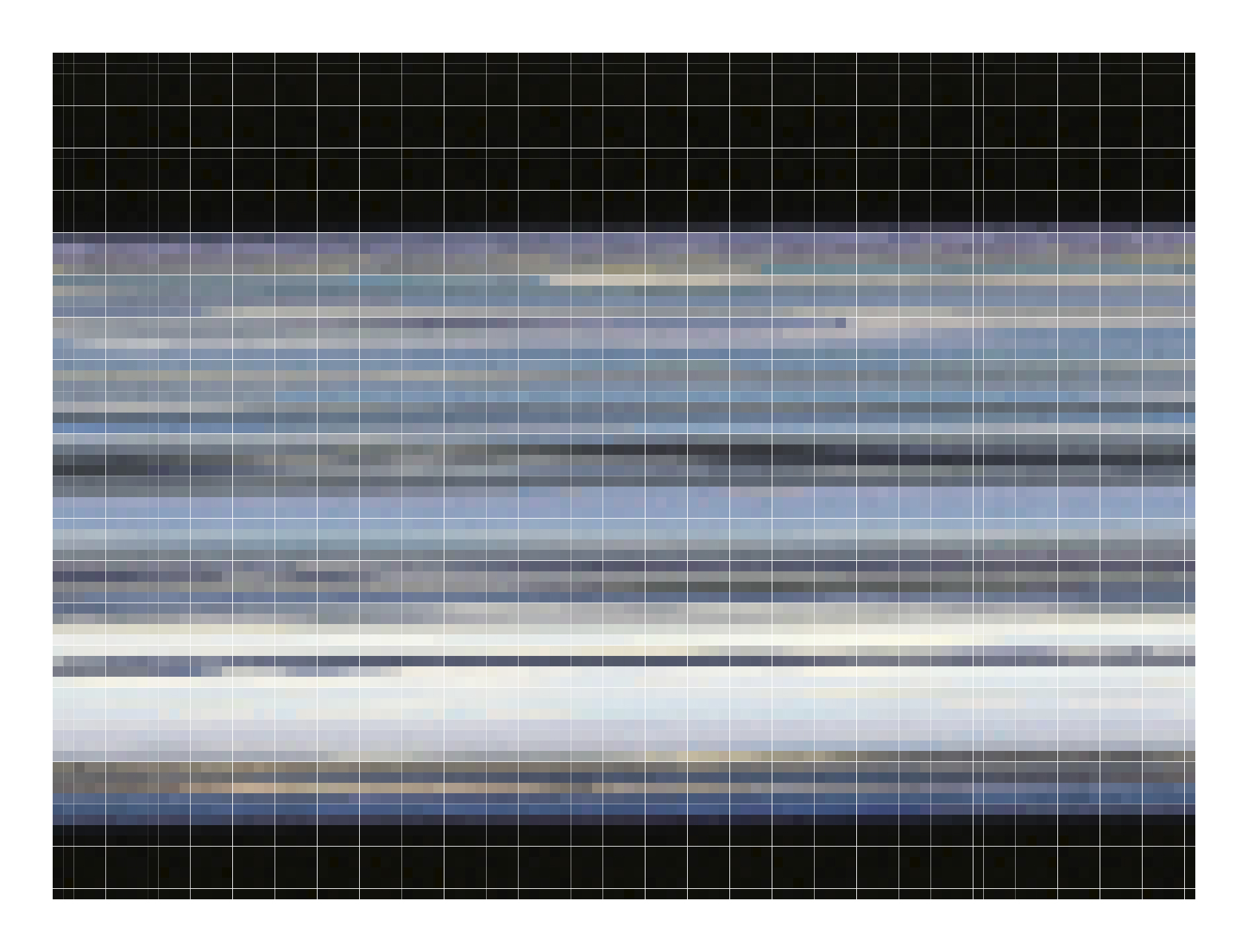 Diese Serie von Prints, die wie ein Fluß anmuten, haben tatsächlich etwas mit Fluß, nämlich dem der Zeit zu tun. Über eine ganze Woche, 24 Stunden pro Tag, wird im Abstand von 10 Sekunden mit einer Kamera Aufnahmen der Landschaft generiert. Jedes Bild wurde auf den Durchschnittswert des Lichts des gesamten Bildes heruntergerechnet. Dann wurden die Bilder eines Tages - 8640 an der Zahl - in Zeilen aufgereiht.