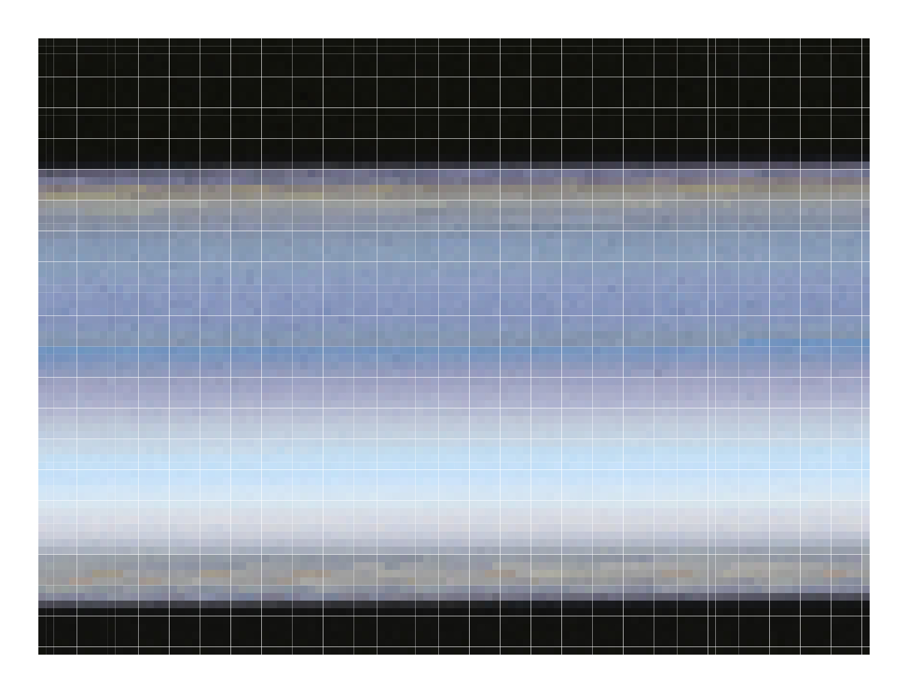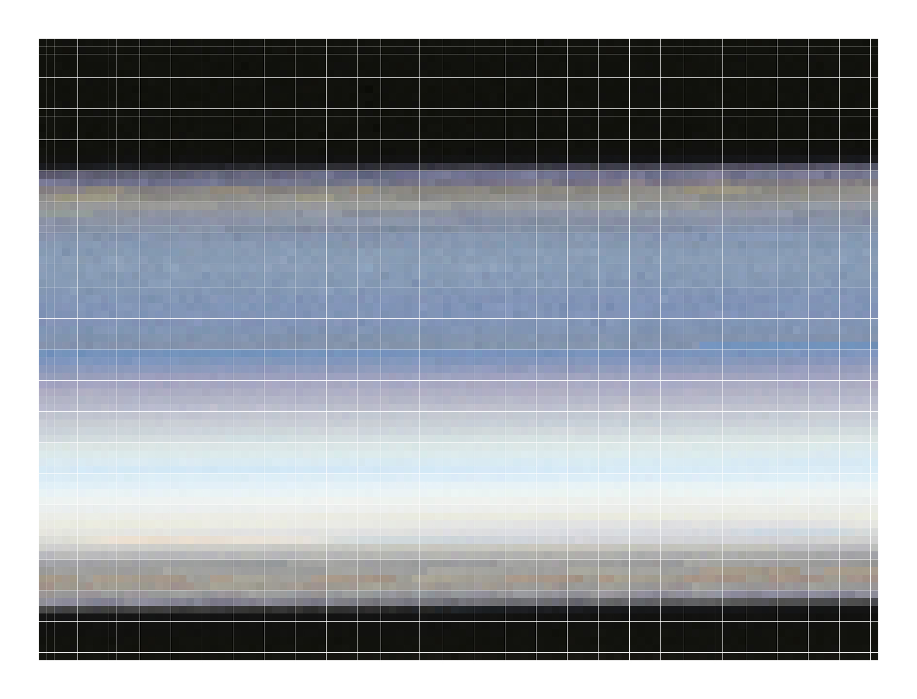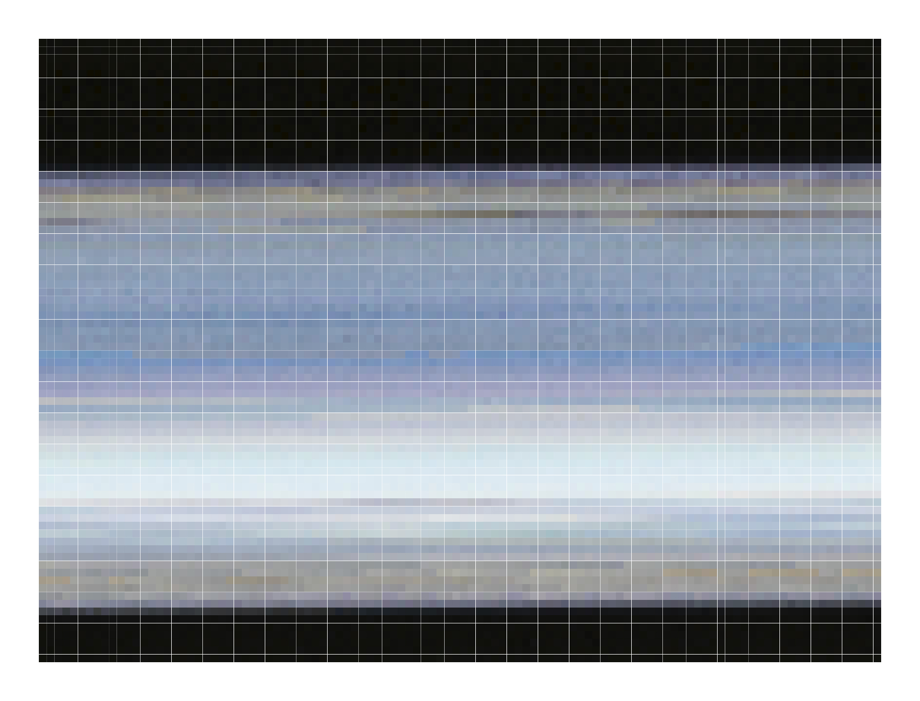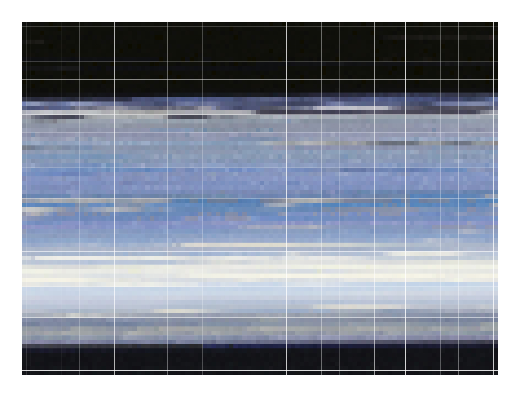 Diese Serie von Prints, die wie ein Fluß anmuten, haben tatsächlich etwas mit Fluß, nämlich dem der Zeit zu tun. Über eine ganze Woche, 24 Stunden pro Tag, wird im Abstand von 10 Sekunden mit einer Kamera Aufnahmen der Landschaft generiert. Jedes Bild wurde auf den Durchschnittswert des Lichts des gesamten Bildes heruntergerechnet. Dann wurden die Bilder eines Tages - 8640 an der Zahl - in Zeilen aufgereiht.